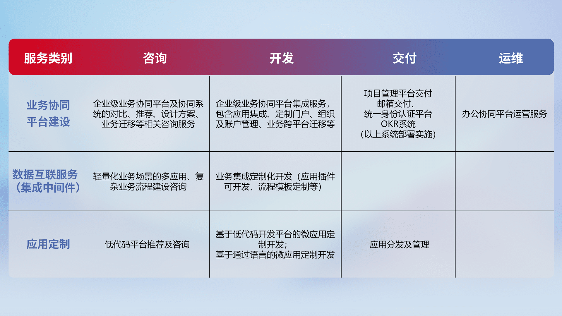 针对钉钉、、企微、、、IDaas等平台级产品提供产品的规划、、、方案、、、交付、、、定制化开发等服务,,,,实现如统一协同办公、、智能客户服务、、、、混合会议管理、、、智能数据查询、、、等业务场景,,实现数字化转型。。。